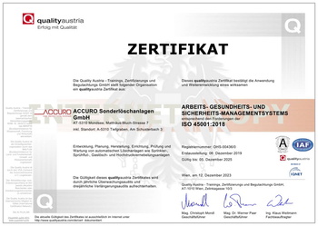 ACCURO ist stets bemüht sein fortschrittliches Sicherheits-, Gesundheits- und Umweltschutzmanagementsystem im Einklang mit den Anforderungen der Kunden zu bringen. Eine risikofreie und sichere Arbeitsumgebung hat oberste Priorität und muss von allen Mitarbeitern und Mitarbeiterinnen angestrebt werden.