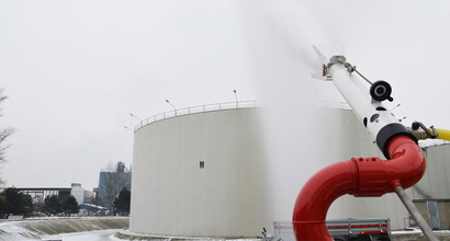 Fixed monitor extinguishing system for protecting storage tanks with around 200,000 m3 of mineral oil products and biogenic raw materials and fuels
