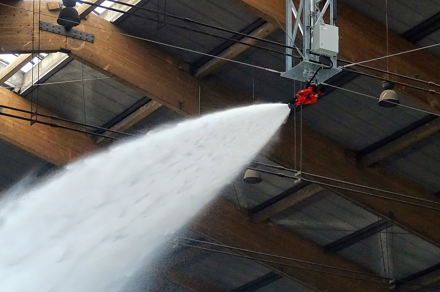 The newly installed fire extinguishing system with automatic monitors with optimally protects the incoming waste storage hall around the clock. If the Early Fire Detection System detects a hot spot, the fire monitor is automatically directed into the affected sector and begins to deliver extinguishing agents. By early detection and cooling of the hot spot, further damage to systems and costly production downtime can be minimized. Likewise, the automatic monitors can be also be operated manually by the plant operator at any time.