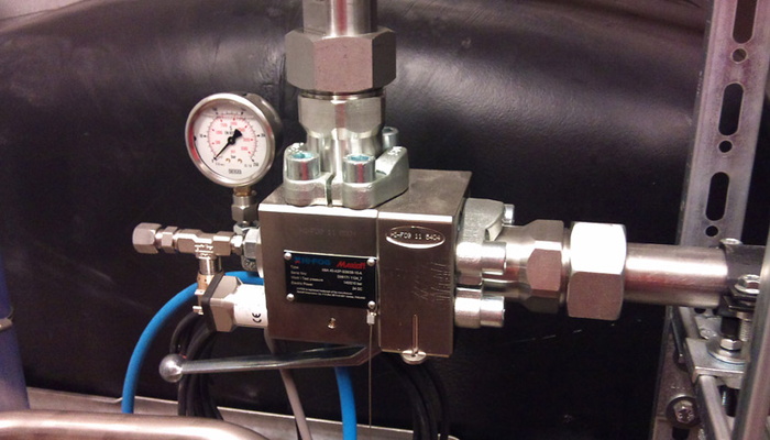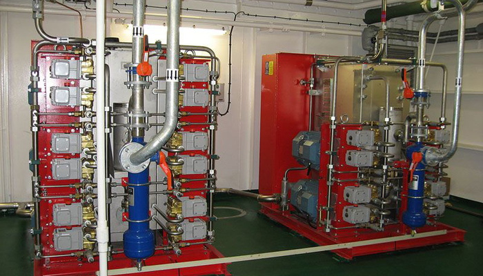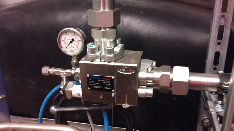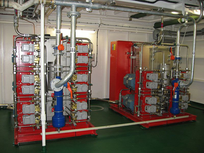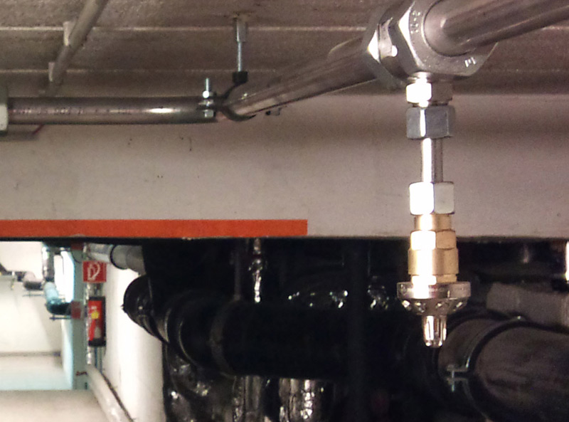 The water mist consists of extremely small droplets of water. The diameter of a droplet of water mist is approx. 50 µm. Under high pressure (> 35 bar), extinguishing water is compressed through the stainless steel pipes to the extinguishing nozzles. Water mist is produced through the special design of the nozzles. The necessary pressure is generated through high-pressure pumps or alternatively through pressurised gas cylinders (nitrogen).