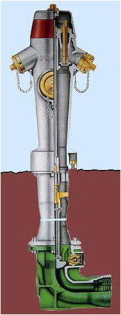 The models may be different depending on country specifications. In most cases, every pillar hydrant has two to three valves. The main valve is operated in the middle. This is attached deep within the hydrant to protect against frost. A side valve is located on both the left and the right. On the side valves, couplings are used to connect the fire brigade hoses (e.g. Storz couplings). After opening the main valve, the water will flow to the side valves and will only be released once the side valve has been opened.