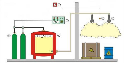 When the system is manually activated (e.g. via the push-button) or after an automatic detection (e.g. via the flame or smoke detector), the extinguishing powder stored in the container (ABC, BC or D powder depending on the application) is pressurised via a propellant, guided through a piping network to the extinguishing nozzles and rapidly sprayed over the extinguishing area.